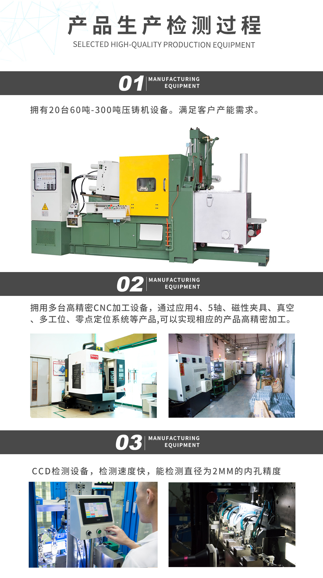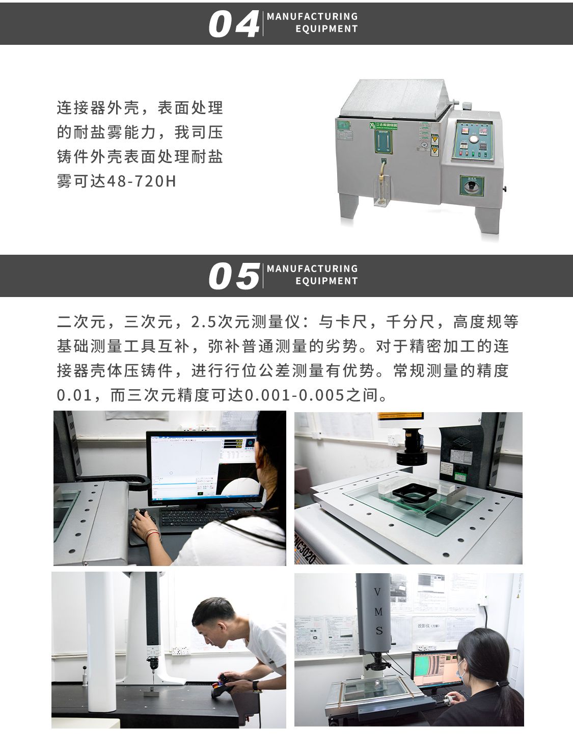 公司設備優勢:配備自動化生產機器設備、壓鑄機配有ABB機器人,CCD檢測設備,二次元,三次元,2.5次元,膜厚儀等檢測設備,以及鹽霧測試機。