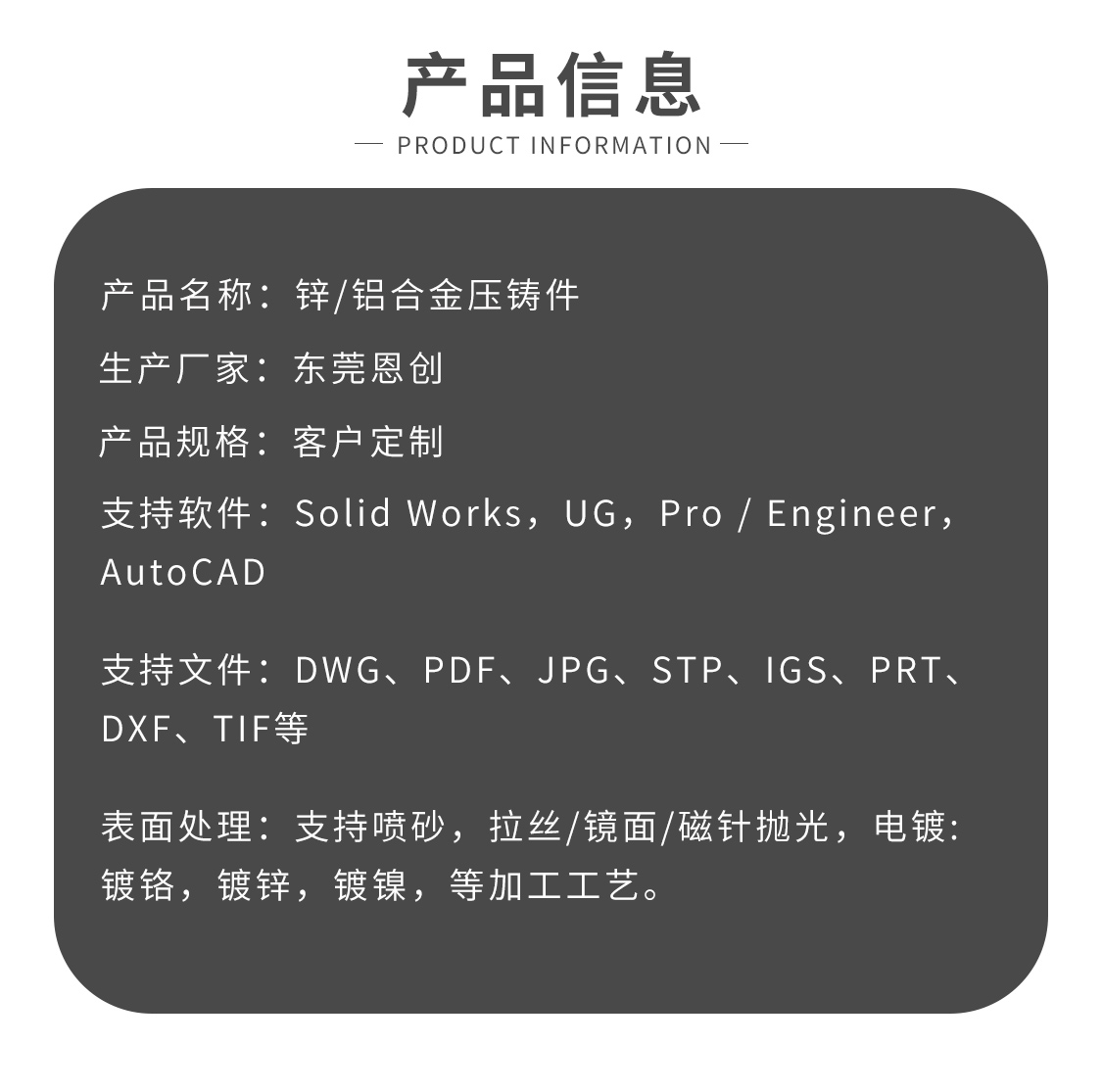 公司經驗優勢:東莞恩創精密五金,精密壓鑄件廠家,我司承諾所有壓鑄鋅合金為全新材料,無渣包料,無水口料,我司出廠精密鋅合金壓鑄件,使用2.5次元,三次元檢測,公差可達+/-0.002,多種表面處理方式均可.